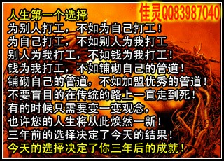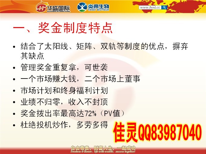 佳靈老師簡(jiǎn)介:華盛國(guó)際團(tuán)隊(duì)核心領(lǐng)導(dǎo)人之一,區(qū)域總監(jiān),團(tuán)隊(duì)金牌講師,白手起家,運(yùn)作湖南炎帝期間親自考察總公司和多個(gè)公司美好生活體驗(yàn)館。炎帝生物第一品牌華盛國(guó)際團(tuán)隊(duì)超級(jí)領(lǐng)導(dǎo)人佳靈老師QQ83987040團(tuán)隊(duì)提供全國(guó)各市場(chǎng)資源共享,講師團(tuán)全國(guó)各地支持。直銷E化,電子商務(wù),您的最佳創(chuàng)業(yè)平臺(tái)!解決了傳統(tǒng)行業(yè)的許多弊端,您我的最佳選擇!(1)保險(xiǎn)賣的是一個(gè)承諾,一個(gè)無形的產(chǎn)品,而直銷賣的是真真實(shí)實(shí),實(shí)實(shí)在在的