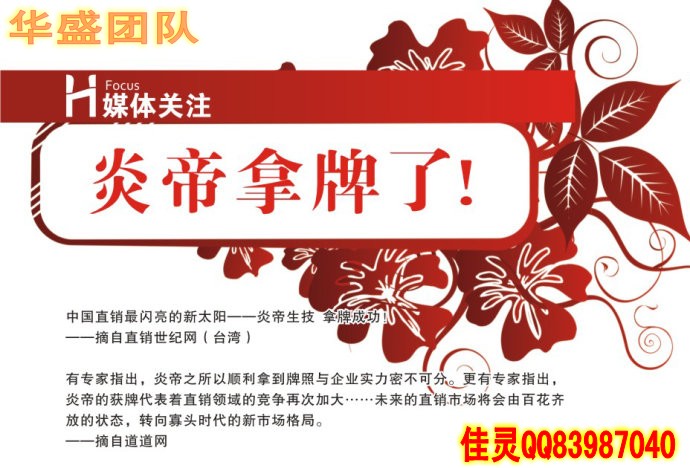 炎帝生物華盛國(guó)際集團(tuán),大夢(mèng)想大格局大啟動(dòng)?。∪A盛國(guó)際領(lǐng)航人,擁有數(shù)十年直銷經(jīng)驗(yàn)和網(wǎng)絡(luò)營(yíng)銷經(jīng)驗(yàn),曾經(jīng)帶領(lǐng)團(tuán)隊(duì)在2個(gè)直銷公司做到中國(guó)區(qū)前三名,團(tuán)隊(duì)3年銷售額超過10億,是中國(guó)唯一個(gè)充分結(jié)合傳統(tǒng)直銷和網(wǎng)絡(luò)營(yíng)銷的頂級(jí)品牌團(tuán)隊(duì)!經(jīng)過全面對(duì)比中國(guó)拿牌31家公司,最終和炎帝強(qiáng)強(qiáng)聯(lián)盟,實(shí)現(xiàn)大夢(mèng)想而大啟動(dòng),誠(chéng)邀各路精英加盟合作!佳靈老師簡(jiǎn)介:華盛國(guó)際團(tuán)隊(duì)核心領(lǐng)導(dǎo)人之一,區(qū)域總監(jiān),團(tuán)隊(duì)金牌講師,白手起家,運(yùn)作湖南炎帝