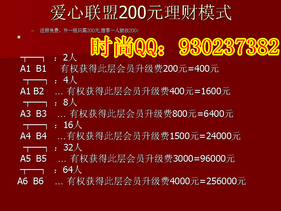 ★★保持您的100%利潤★★不需要等待公司支付★★直接向您付款★★2x6強制矩陣★★只需要200元來啟動,所有人都能承擔得起★★沒有每月的服務(wù)費也沒有管理費★★您也為所需要幫助的人,獻出您的愛心《愛心聯(lián)盟創(chuàng)業(yè)規(guī)則》創(chuàng)業(yè)咨詢qq930237382游戲的具體規(guī)則如下:1.凡年滿18歲的公民,自愿繳納200元的創(chuàng)業(yè)金,即可成為愛心聯(lián)盟創(chuàng)業(yè)團隊的正式會員,享有愛心聯(lián)盟會員的一切權(quán)利和義務(wù)。一旦確認為愛心聯(lián)