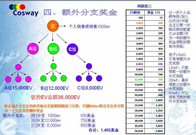 科士威獎(jiǎng)金制度一共有四種獎(jiǎng)金:個(gè)人銷(xiāo)售獎(jiǎng)金、分支差額獎(jiǎng)、分支表現(xiàn)獎(jiǎng)、額外分支獎(jiǎng)下面以個(gè)人月銷(xiāo)售業(yè)績(jī)1000ev,A、B、C部門(mén)(分支)月業(yè)績(jī)分別是15000ev、12000ev、8000ev這樣的例子為例為您講解第一種個(gè)人銷(xiāo)售獎(jiǎng)金此月您的個(gè)人銷(xiāo)售(或個(gè)人消費(fèi))的業(yè)績(jī)是1000ev,對(duì)比一下1000ev本是6%,但是不是就只乘6%呢!不是,而是乘于你總業(yè)績(jī)的那個(gè)百分比,看上圖你的總業(yè)績(jī)是:1000e