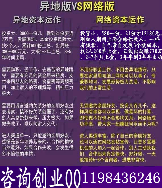 全職在線導師【費晴】QQ1198436246全天在線真誠交流朋友你好,看到這個貼說明你是接觸過異地的。首先我們從事異地都是對那種掙錢的模式很認可的,模式是個好模式,可為什么這么難做呢?網(wǎng)資是異地的網(wǎng)絡版本,解決了異地的弊端,發(fā)展困難的缺點所產(chǎn)生的,同樣的模式,不同的方法,不需要你去用謊言邀約自己親人朋友,不用承受感情的壓力,生活的壓力。網(wǎng)資產(chǎn)生于異地更勝于異地,朋友可以加我QQ1198436246