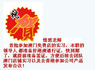 實(shí)習(xí)店長(zhǎng):惜恩Q7572369222012隨著大陸市場(chǎng)科士威的爆發(fā),我們王者眾贏團(tuán)隊(duì)迎來(lái)了澳門(mén)的首家免費(fèi)店,很幸運(yùn)這次有機(jī)會(huì)去澳門(mén)參加店長(zhǎng)實(shí)習(xí),澳門(mén)是一個(gè)非常漂亮的城市。澳門(mén)北鄰珠海,東與香港相距60公里,中間以珠江口相隔。澳門(mén)是一個(gè)自由港,也是世界四大賭城之一。自從澳門(mén)回歸中國(guó)之后,經(jīng)濟(jì)迅速增長(zhǎng),經(jīng)濟(jì)繁榮,他比較出名的是輕工業(yè)、美食、旅游業(yè)、酒店和娛樂(lè)場(chǎng),澳門(mén)現(xiàn)在也是亞洲最發(fā)達(dá)、最富裕的地區(qū)。澳