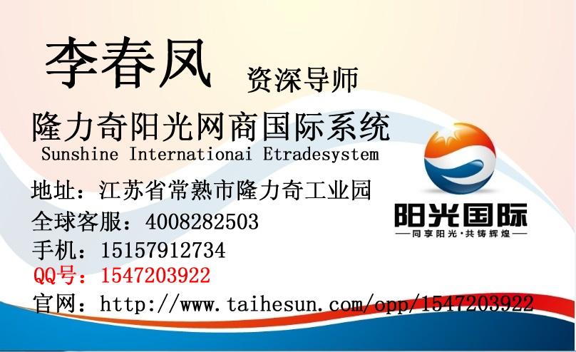 隆力奇陽光國際高級講師【李春鳳老師】QQ1547203922☆隆力奇陽光國際全球策略委員☆隆力奇陽光國際核心領(lǐng)袖☆隆力奇陽光國際創(chuàng)業(yè)導(dǎo)師如果您厭倦了為別人打工,以苦力交換金錢的生活;如果您厭倦了安利完美直銷的業(yè)績壓力和無奈的超前消費;如果您厭倦了東奔西跑而顧不了家的異地資本運作;如果您為急功近利玩時時彩或炒股輸?shù)煤軕K;開淘寶店為了買家而發(fā)愁;如果您經(jīng)營的其它事業(yè)并不順利;如果您很想自己當(dāng)老板并在家