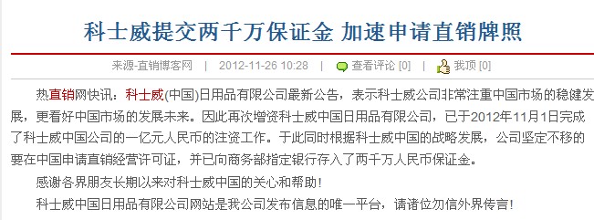 現(xiàn)在沒(méi)有,不過(guò)馬上有了。那有的朋友會(huì)問(wèn),沒(méi)有直銷(xiāo)牌照,合法嗎?首先電子商務(wù)還沒(méi)有立法,所以不存在合法不合法的問(wèn)題。再次大家都是知道,在中國(guó)維邁店鋪里都是科士威的產(chǎn)品。而且在2010年3月2日,中國(guó)科士威有限公司已經(jīng)注冊(cè),注冊(cè)號(hào):440101400033224,不過(guò)由于中國(guó)的過(guò)請(qǐng),必須拿到直銷(xiāo)牌照,