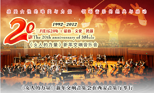 1月11日,三八婦樂集團20周年慶典暨《女人的力量》新年交響音樂會在西安音樂廳舉行。咸陽市人民政府副市長嚴維佳、楊凌示范區(qū)管委會副主任劉慶、西安市政府副秘書長陳松林、西安市工商局副局長任乃孝、西安市商務(wù)局副局長黃漪清、西安市工商局經(jīng)檢分局局長馬超、三八婦樂集團董事長袁曉峰、總經(jīng)理韓美寧等出席,來自全國各地的三八婦樂經(jīng)銷商以及三八婦樂員工一千余人參加了慶典,并欣賞了由西安交響樂團演奏的大型交響音樂會。