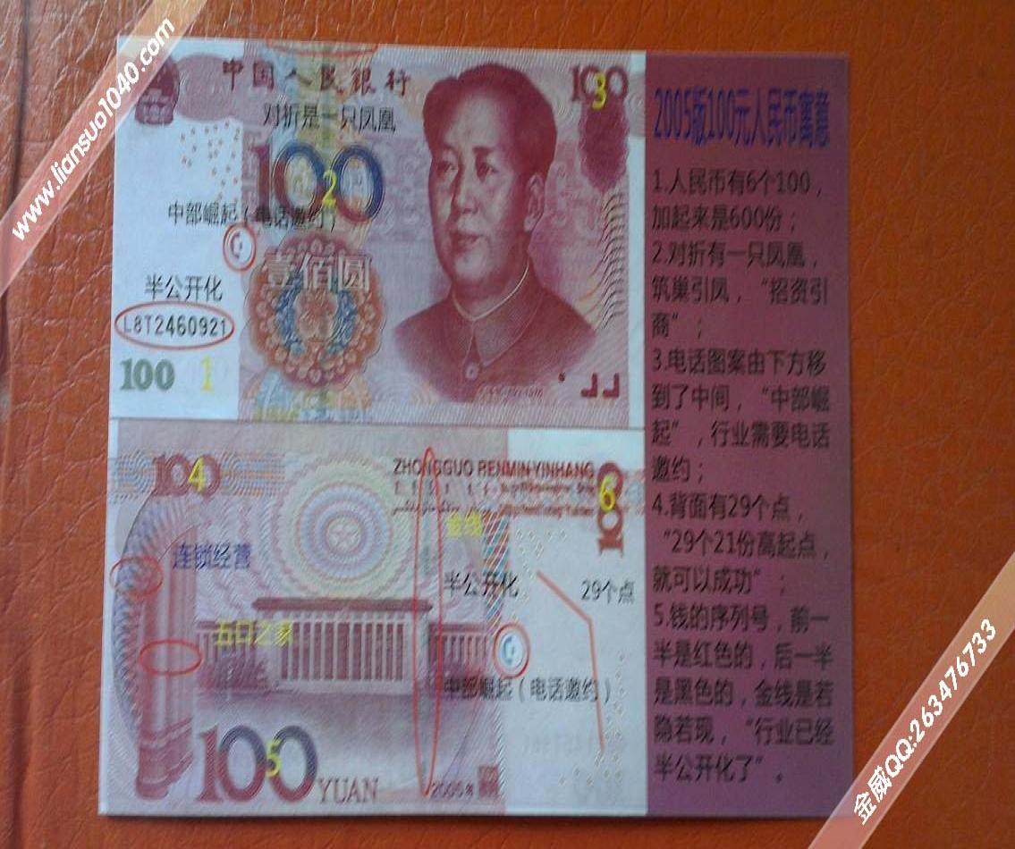 考察過資本運(yùn)作行業(yè)的朋友都知道2005版的100元人民幣被從事行業(yè)的人員拿出來解釋說是G家在引進(jìn)行業(yè)到合肥之前已經(jīng)規(guī)劃好了行業(yè)發(fā)展區(qū)域,由西部引薦到中部來,這解釋讓我們更容易接受行業(yè),認(rèn)為安徽資本運(yùn)作行業(yè)就是G家在背后支持的行業(yè)。那么下面就講講我在了解這個(gè)行業(yè)的時(shí)候我聽到的2005版100元人民幣的玄機(jī)以及和安徽自愿連瑣經(jīng)營(yíng)業(yè)的關(guān)系。