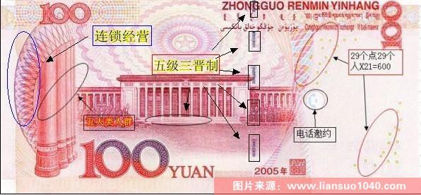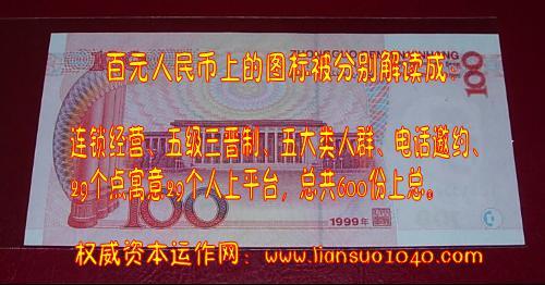 百元人民幣上的圖標(biāo)被分別解讀成:連瑣經(jīng)營(yíng)、五級(jí)三晉制、五大類人群、電話邀約、29個(gè)點(diǎn)寓意29個(gè)人上平臺(tái),總共600份上總。