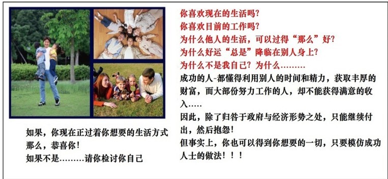 有些人的一生,100%靠自己的努力賺取收入,實在很令人贊嘆。當您想到這里,幾乎生活中每件事都要靠分工合作。您住的房子不是自己蓋的,車子不是自己設計的,連您在用的這部計算機也不是自己組的。您利用別人的才智和努力來打造生活?,F(xiàn)在起,您可以不必這么辛苦,您可以用聰明的方法工作。我們會告訴您如何將這個模式套用在您身上!有了和贏系統(tǒng),您可以自己當老板!