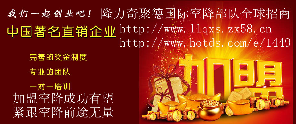 隆力奇聚德國際空降部隊(duì)財(cái)富聯(lián)盟湖南隆力奇為千千萬萬敢于挑戰(zhàn)高薪的行業(yè)精英提供支持與服務(wù),民族隆力奇、百年隆力奇、世界隆力奇提供平臺(tái)。湖南隆力奇黃曉蓉http://www.jujue309.cn/e/4003打造中國最大最專業(yè)的網(wǎng)絡(luò)直銷門戶,熱直銷網(wǎng)開拓網(wǎng)絡(luò)直銷新浪潮!