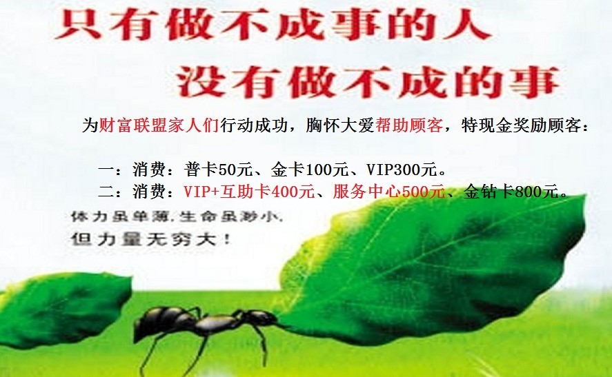 為慶祝財(cái)富聯(lián)盟六大常委隆重登場,為輔助財(cái)富家人行動(dòng)成功,胸懷大愛幫助和關(guān)愛顧客,特推出現(xiàn)金獎(jiǎng)勵(lì)顧客,讓顧客一進(jìn)門就賺錢: