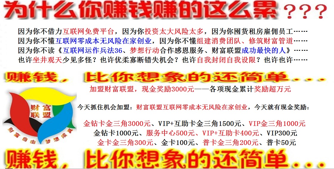 財(cái)富聯(lián)盟尋找和幫助不愿意東奔西跑勞苦奔波受盡風(fēng)吹雨打嚴(yán)寒酷署煎熬,而希望在家創(chuàng)業(yè)以小博大一根網(wǎng)線一臺(tái)電腦一杯咖啡一件睡衣,就可以輕松借助互聯(lián)網(wǎng)零成本在家創(chuàng)業(yè),服務(wù)全球消費(fèi)者的順應(yīng)時(shí)代趨勢大成功的有志之士、 尋找和幫助 本身已有工作但想兼職在互聯(lián)網(wǎng)零成本在家創(chuàng)業(yè)修筑財(cái)富管道的有志之士、 尋找和幫助 不方便外出上班辛苦打工,必須在家照顧親人孩子的家庭主婦和模范煮夫借助互聯(lián)網(wǎng)零成本在家創(chuàng)業(yè)以及年老體弱不方便外出的退休養(yǎng)老之人……