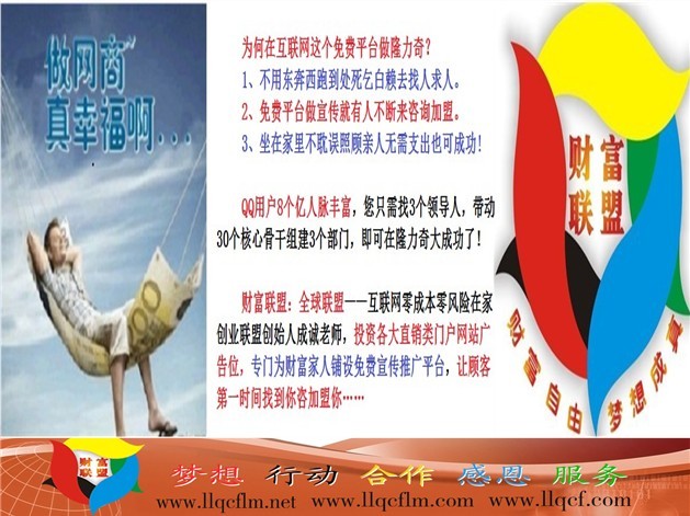2013年4月——5月間,財(cái)富聯(lián)盟:全球聯(lián)盟——互聯(lián)網(wǎng)零成本零風(fēng)險(xiǎn)在家創(chuàng)業(yè)聯(lián)盟,投入重金進(jìn)駐各大直銷類門戶網(wǎng)站,購買廣告位,為財(cái)富家人免費(fèi)提供宣傳展示招商的平臺(tái),目前已經(jīng)在直銷人網(wǎng)、熱直銷網(wǎng)、中國直銷網(wǎng)、直銷專業(yè)網(wǎng)、環(huán)球直銷網(wǎng)、經(jīng)典創(chuàng)業(yè)網(wǎng)等各家直銷媒體平臺(tái),扶持幫助伙伴們快速成功,早日夢想成真!