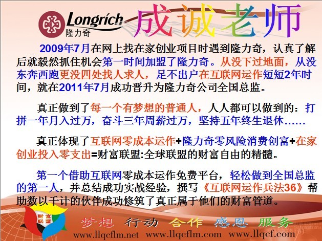 成誠老師加盟隆力奇的時(shí)候,他就創(chuàng)辦了隆力奇財(cái)富聯(lián)盟:全球聯(lián)盟——互聯(lián)網(wǎng)零成本零風(fēng)險(xiǎn)在家創(chuàng)業(yè)導(dǎo)師,并提出了夢想、行動(dòng)、合作、服務(wù)、感恩五大直銷理念。在互聯(lián)網(wǎng)上全心全意為傘下伙伴服務(wù),他的《互聯(lián)網(wǎng)直銷運(yùn)作實(shí)戰(zhàn)——兵法36計(jì)》在直銷界頗有盛譽(yù)。
