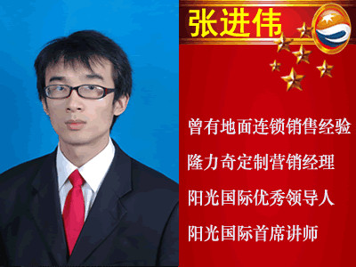 張進偉,河南人,計算機畢業(yè)!隆力奇全球定制營銷經(jīng)理,隆力奇陽光國際系統(tǒng)金牌班主任,隆力奇陽光國際優(yōu)秀領(lǐng)導(dǎo)人。曾經(jīng)在國企上班,從事過地面商務(wù)商會運作,有過豐富的直銷經(jīng)驗,懷著一份不平凡的心,于2012年5月通過互聯(lián)網(wǎng)接觸了隆力奇電子商務(wù)事業(yè),加盟陽光網(wǎng)商國際系統(tǒng),通過自身能力,迅速開避市場,組建一支最具有競爭力的營銷團隊,并堅信帶領(lǐng)自己傘下更多的伙伴走向成功。我的人生格言是:不相信奇跡的人永遠不會創(chuàng)造奇跡。心有多大,舞臺就有多大!