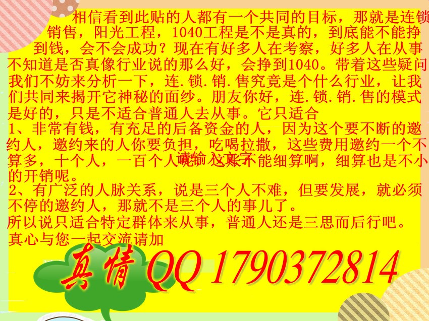 朋友你好:或許我們都有著類似的經(jīng)歷,2011年年初,我被朋友用謊言邀約到異地考察行業(yè),和多數(shù)人一樣在煩躁、惱怒、抵觸、懷疑的情緒中開(kāi)始了解異地資笨運(yùn)作,隨著考察的深入,對(duì)行業(yè)的認(rèn)識(shí)和態(tài)度也逐漸轉(zhuǎn)變,通過(guò)7天的考察和幾天的考慮及籌備,開(kāi)始了我認(rèn)為會(huì)改變我一生的陽(yáng)光之路。然而事實(shí)并非之前想象的那樣順利,迫于各種壓力,沒(méi)堅(jiān)持多久,我放棄了。我愿把我的認(rèn)識(shí)與感想分享給您,希望能幫助您全面客觀的分析這個(gè)行業(yè),然后做出正確的選擇。真誠(chéng)交流★浩瀚:QQ906792885★揭秘異地剖析網(wǎng)資異地必須了解的十個(gè)問(wèn)題【第一】合法還是違法???詳細(xì)咨詢交流加扣扣:浩瀚906792885法律的基本原則:有法可依、有法必依、執(zhí)法必嚴(yán)、違法必究。目前沒(méi)有任何一部法律來(lái)約束資笨運(yùn)作,所以不違法,也不合法。那么由誰(shuí)來(lái)管理呢?是不是放縱行業(yè)任意發(fā)展呢?肯定不是。媒體,輿論的負(fù)面宣傳,本身就是一種行之有效的管理、限制手段。雖然大多數(shù)異地從業(yè)者以失敗告終,然而在這個(gè)龐大的人口基數(shù)下,成功者的數(shù)量也是不少的,我認(rèn)識(shí)的也有幾個(gè),到目前為止沒(méi)有任何人或組織找他們的麻煩,基本都做了自己的生意,或大或小。有的說(shuō)上總了有什么生命危險(xiǎn),目前我沒(méi)聽(tīng)說(shuō)過(guò),更沒(méi)見(jiàn)過(guò)。【第二】抓人是真的還是假的??詳細(xì)咨詢交流加扣扣:浩瀚906792885有的是真的,有的是假的!假的多,真的少!例行的調(diào)控,走過(guò)場(chǎng),會(huì)把行業(yè)里面的人帶進(jìn)派出所,把家里面的東西從窗戶往外仍,桌子、椅子、廚具……乒乒乓乓,聲勢(shì)造的越大越好,有時(shí)候還有錄像的,圍觀的當(dāng)?shù)厝嗽蕉嘣胶?。進(jìn)去后,一般是傍晚的時(shí)候放出來(lái),因?yàn)檫@個(gè)時(shí)候當(dāng)?shù)厝硕蓟丶伊?,悄悄的放出?lái),當(dāng)?shù)厝艘詾榍采⒒丶伊?。針?duì)有的體系發(fā)生了刑事案件,或者體系本來(lái)就不健康,當(dāng)?shù)亍菊扛胨麄冓s走,那么這樣的調(diào)控就是來(lái)真格的,把所有的人遣散走,至于回不回家沒(méi)關(guān)系,反正不要在我這里做就行了。每年都有被趕走的體系,因?yàn)楫?dāng)?shù)匾S穩(wěn),要保持行業(yè)健康?!镜谌克麄冋f(shuō)的話都是真的嗎??個(gè)人的經(jīng)歷,一般沒(méi)有說(shuō)假話的,因?yàn)楸緛?lái)行業(yè)就追求人人平等,而且很多平凡角色成功的案例,可以拿來(lái)做正面教材。行業(yè)的經(jīng)歷,一般沒(méi)有說(shuō)真話的,道理再簡(jiǎn)單不過(guò)了,報(bào)喜不報(bào)憂!行業(yè)本身有難度,發(fā)展不動(dòng)回家的,你自然見(jiàn)不著。有的人來(lái)了三、四年了都還沒(méi)成功,要實(shí)話實(shí)說(shuō)的話誰(shuí)還敢做?所以都告訴你:我來(lái)了半年了,或者一年了,發(fā)展的不錯(cuò),很快就要上總了。。?!镜谒摹啃袠I(yè)三座大山是什么??詳細(xì)咨詢交流加扣扣:浩瀚9067928851.市場(chǎng)壓力叫花子都有三個(gè)朋友難道你沒(méi)有嗎?這句話刺激了很多的人加入。其實(shí),仔細(xì)的分析下這三個(gè)人,實(shí)質(zhì)是三片市場(chǎng)。行業(yè)發(fā)展的是人際網(wǎng)絡(luò),而人際網(wǎng)絡(luò)有個(gè)天然的死穴——互相之間有聯(lián)系。所以一旦來(lái)了個(gè)不認(rèn)可的,回去后經(jīng)他一宣傳,整片市場(chǎng)完蛋,這速度可不止于三的倍增了,不管你有多少的親戚朋友,全都不會(huì)來(lái)了。你知道你朋友干傳銷了,你還會(huì)去嗎?這是80%失敗者的主要原因。2.經(jīng)濟(jì)壓力邀約考察絕不僅僅是三個(gè)人,我一共接了八個(gè)人,而每個(gè)人的花費(fèi),最少的1500,一般都在2000左右,你幫我算算我光接人就花了多少錢?我說(shuō)我現(xiàn)在做的是幾百上千萬(wàn)的生意,那么即使我以前是個(gè)叫花子,現(xiàn)在也要花錢包裝一下自己:住好的房子,穿好的,吃好的,花錢大方,加上房租及日常的生活開(kāi)銷,手里沒(méi)幾萬(wàn)運(yùn)作資金真玩不轉(zhuǎn)。3.精神壓力因?yàn)槲覀兪怯弥e言叫去的人,所以那些看不懂的人肯定得罪了,而且,他告訴別人后,連那些沒(méi)來(lái)的人都得罪了,為什么?在中國(guó),做傳銷,很多人認(rèn)為是比坐牢還恥辱的事情!所以很多異地的朋友,一邊要承受發(fā)展不好所帶來(lái)的經(jīng)濟(jì)壓力,同時(shí)要忍受親戚朋友的指責(zé),甚至是辱罵,毫不夸張,那樣的日子,你準(zhǔn)備好了嗎?【第五】成功概率有多大??平均5%以內(nèi),不可能像異地的人說(shuō)的100%。成功概率還和體系的健康程度有關(guān)系,親情線發(fā)展過(guò)多,那就是一將功成萬(wàn)骨枯。【第六】我適合做行業(yè)嗎??我們把異地從業(yè)者簡(jiǎn)單的分成三大類。詳細(xì)咨詢交流加扣扣:浩瀚906792885第一類:成功人士有錢有關(guān)系,但同時(shí)他們的弊端也很明顯。1.容易放棄行業(yè),來(lái)的時(shí)間一久,自然知道行業(yè)的困難,而丟7萬(wàn)塊錢對(duì)他們無(wú)足輕重。2.不會(huì)全職運(yùn)作,經(jīng)常往返于外地和行業(yè)之間,而行業(yè)有很多事情,只有全職才能做好。3.不叫自己的