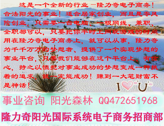 隆力奇陽(yáng)光國(guó)際電子商務(wù),以地面、網(wǎng)絡(luò)發(fā)展相結(jié)合,天網(wǎng)、地網(wǎng)、人網(wǎng)三網(wǎng)合一,是我們每一個(gè)普通平凡的人,能夠快速倍增財(cái)富的有力保障。