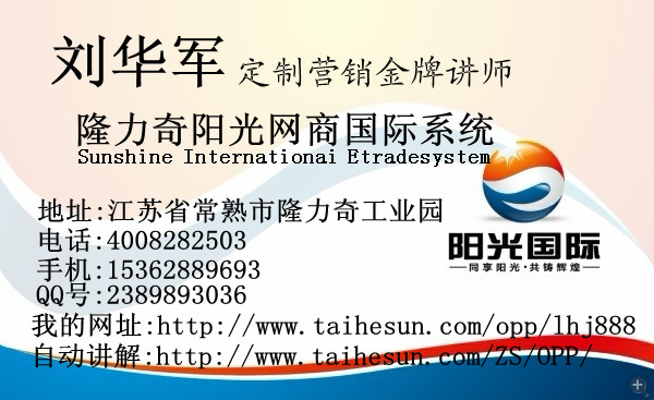 隆力奇陽光國際創(chuàng)業(yè)導(dǎo)師劉華軍老師 手機(jī):15362889693 QQ:2389893036