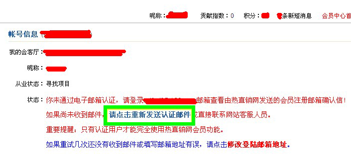 3、 如果你確定郵箱地址沒(méi)有填寫(xiě)錯(cuò)誤,而且也沒(méi)有在垃圾信箱中找到注冊(cè)確認(rèn)信,那么你可以嘗試點(diǎn)擊會(huì)員中心的“請(qǐng)點(diǎn)擊重新發(fā)送認(rèn)證郵件”。