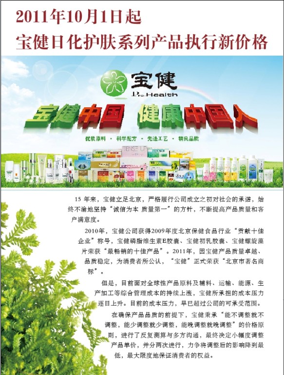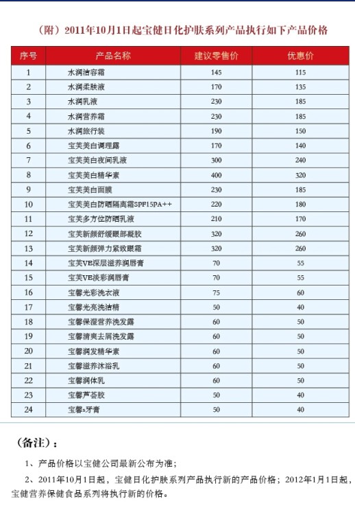 寶健日化護(hù)膚系列產(chǎn)品調(diào)價2011年10月1日起執(zhí)行