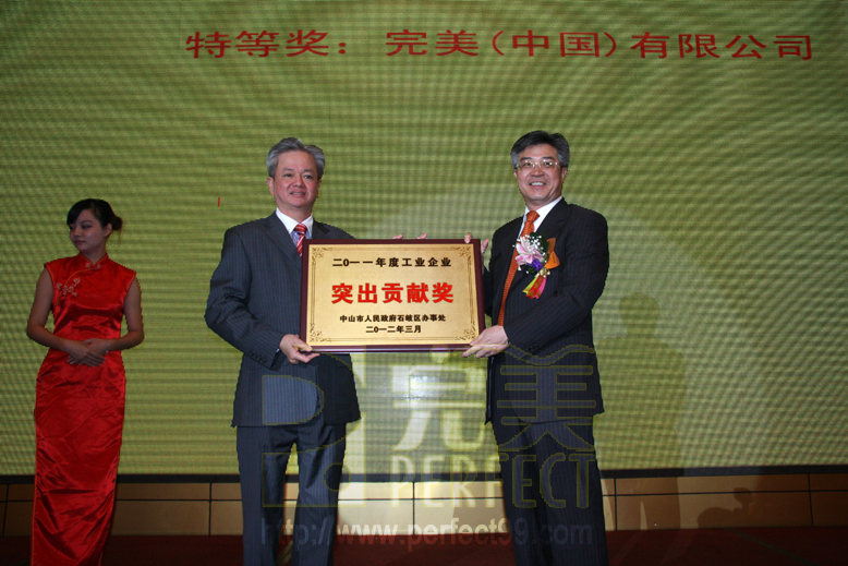完美公司憑借2011 年為中山經(jīng)濟(jì)發(fā)展做出突出貢獻(xiàn),榮獲石岐區(qū)“2011年度總部經(jīng)濟(jì)突出貢獻(xiàn)獎(jiǎng)特等獎(jiǎng)”、“2011年度企業(yè)黨建促發(fā)展先進(jìn)獎(jiǎng)”、“2011年度工業(yè)企業(yè)突出貢獻(xiàn)獎(jiǎng)”,獎(jiǎng)金總額高達(dá)1200余萬元,此舉也創(chuàng)下了中山對(duì)單體企業(yè)獎(jiǎng)勵(lì)金額的歷史最高紀(jì)錄。中山市委副書記、市長陳茂輝,市政協(xié)主席丘樹宏為古董事長頒發(fā)了榮譽(yù)牌匾及獎(jiǎng)金。
