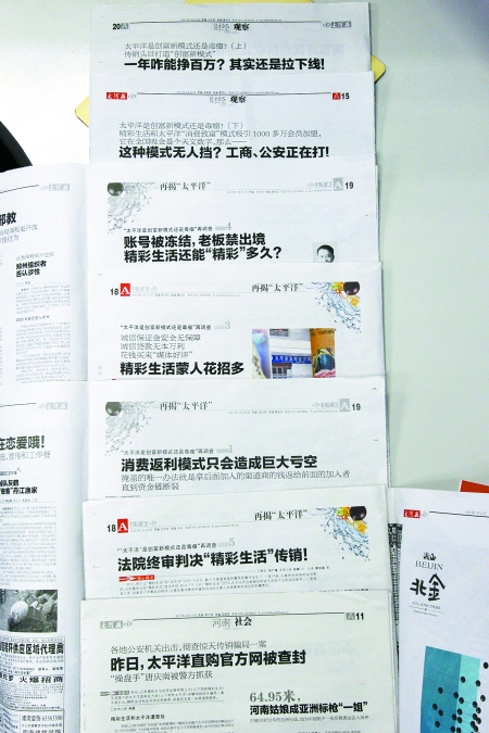 4月20日,河南省工商局召開新聞發(fā)布會(huì)宣布“精彩生活”為特大傳銷案、本報(bào)刊發(fā)《為討保證金,渠道商抱團(tuán)起訴“精彩生活”》后,“精彩生活”和“太平洋”終于低頭認(rèn)罪:4月21日,“太平洋”在官方網(wǎng)站首頁,用大紅標(biāo)題發(fā)出“精彩生活公司相關(guān)人員涉嫌傳銷被依法查處”的公告。