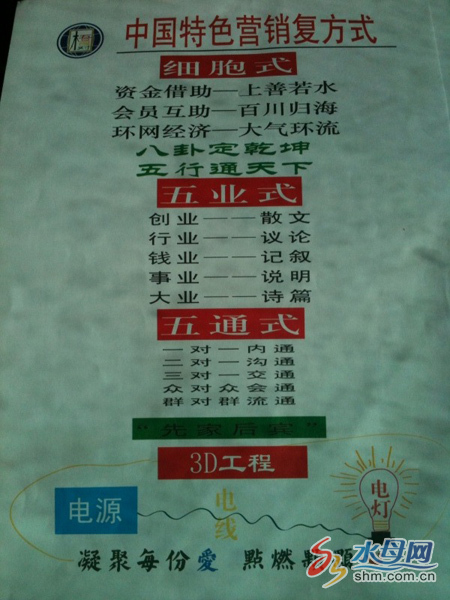 那為婦女也跟著給記者講述了一番 :“‘中國明明商’是國家300個(gè)科學(xué)智囊團(tuán)研究15年的結(jié)果, 都與卦象、天意、生命奇跡等有關(guān)聯(lián)。新的時(shí)代已經(jīng)開始了,我們要走新時(shí)代的路。 所以說人類最高的智慧用一個(gè)字來代替———‘借’……可以說將來連活也不用干了,你們有福就趕快進(jìn)來拿錢。 ”