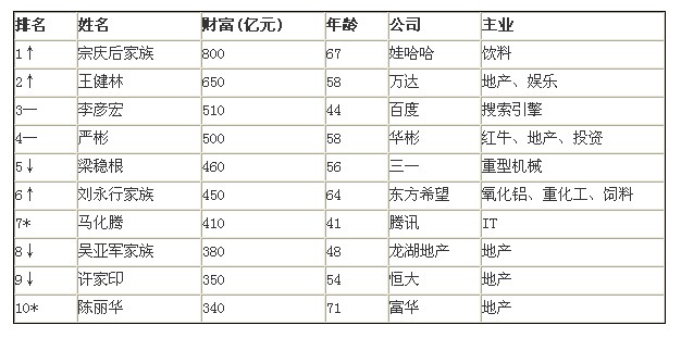 前10名中有2位新人,分別是排名第七的馬化騰和排名第十的陳麗華。來(lái)自房地產(chǎn)行業(yè)的富豪人數(shù)最多,達(dá)5位,比去年多一位。以飲料、IT為主業(yè)的富豪各有2位。平均年齡為56歲,比總榜大4歲。有3位做過(guò)百富榜的首富。