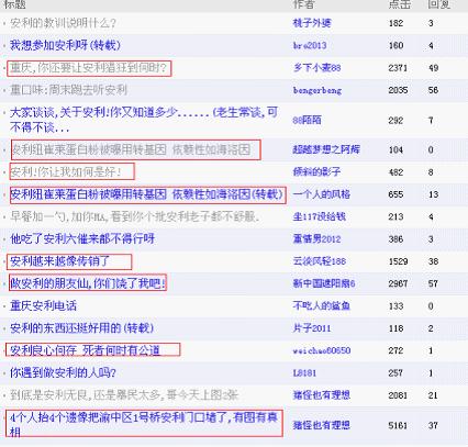 近日,網(wǎng)友“鄉(xiāng)下小麥88”在重慶天涯論壇上發(fā)帖《重慶,你還要讓安利猖狂到何時?》,稱“重慶現(xiàn)在已經(jīng)成為違法直銷的重災區(qū)了,其中以安利的危害范圍最廣,危害程度最深,受害群眾最多?!本W(wǎng)友稱自己是一名來重慶與女友一起創(chuàng)業(yè)的大學畢業(yè)生,結果女友一家人都深陷安利,全家人吃安利的營養(yǎng)品,生病也拒絕吃藥,每天不擇手段的拉人去接觸安利。網(wǎng)友還詳細列舉了安利的危害和違法行為: