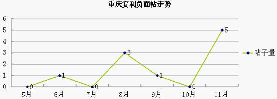 據(jù)金雕工作室統(tǒng)計,5-11月份,重慶安利的負面帖呈上升態(tài)勢,11月份達到最高,且輿情關注度也達到最高,點擊量達到4千余條,回復量也逾百條。
