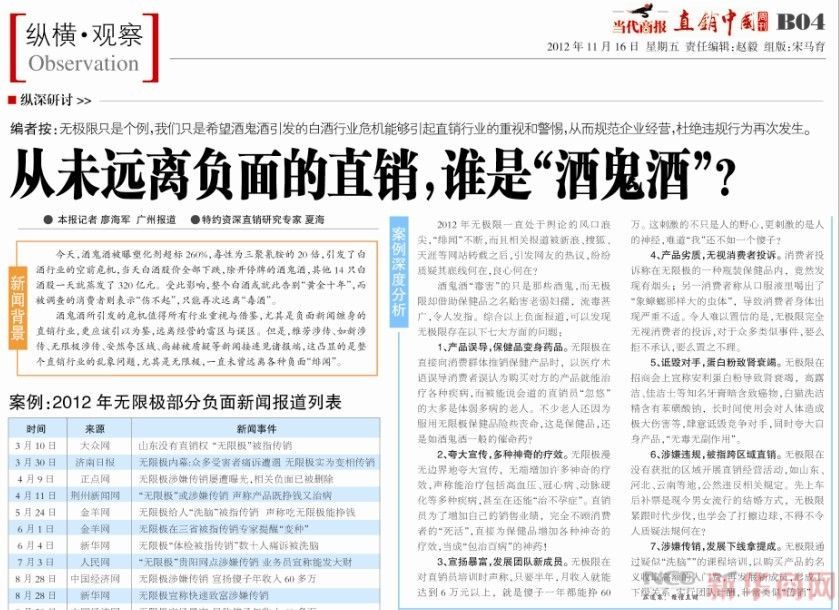 酒鬼酒所引發(fā)的危機值得所有行業(yè)重視與借鑒,尤其是負面新聞纏身的直銷行業(yè),更應(yīng)該引以為鑒,遠離經(jīng)營的雷區(qū)與誤區(qū)。但是,雅芳涉?zhèn)鳌⑷缧律鎮(zhèn)?、無限極涉?zhèn)鳌?a href="http://www.jujue309.cn/company/48.html" target="_blank">安然夸區(qū)域、尚赫被質(zhì)疑等新聞接連見諸報端,這凸顯的是整個直銷行業(yè)的亂象問題,尤其是無限極,一直未曾遠離各種負面“緋聞”。