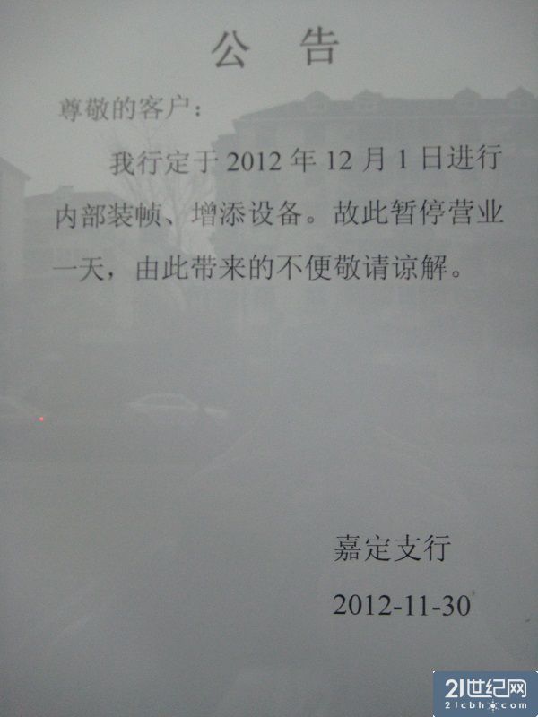 12月1日周六下午2時許,21世紀網(wǎng)趕至上海市郊嘉定區(qū)的銀行一條街,事發(fā)的華夏銀行嘉定支行大門緊鎖。門上貼有公告:“我行定于2012年12月1日進行內部裝禎、增添設備。故此暫停營業(yè)一天?!?/p>