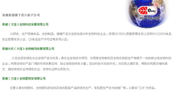 大連易健公司網(wǎng)站對外發(fā)布的公開信息顯示:"大連易健是2008年2月注冊成立的,注冊資金為1203萬美元(折合人民幣8000萬元),以研發(fā)、生產(chǎn)保健食品、生物制品、健康產(chǎn)品為主"。在易健集團介紹中詳細介紹了易健集團旗下的六家子公司,第一是易健生物科技,第二是易健興農(nóng)生物制劑有限公司,而這個易健興農(nóng)生物制劑發(fā)展有限公司就是涉嫌坑農(nóng)的那家公司。而且據(jù)知情人透露,易健生物和易健興農(nóng)的經(jīng)銷商有很多是兩家產(chǎn)品都銷售推廣,當時出面處理煙臺坑農(nóng)事件的馬姓副總就是大連易健集團常務(wù)副總裁馬郡成,坑害果農(nóng)的事情到目前為止還沒有處理結(jié)果。
