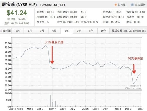 2012年12月19日,阿克曼發(fā)布做空?qǐng)?bào)告稱(chēng)康寶萊以誤導(dǎo)性的財(cái)務(wù)信息掩蓋公司業(yè)務(wù)本質(zhì),通過(guò)發(fā)展會(huì)員來(lái)賺錢(qián),而不是賣(mài)產(chǎn)品來(lái)賺錢(qián)的銷(xiāo)售模式,存在金字塔式騙術(shù)。當(dāng)日收盤(pán)康寶萊股價(jià)再次暴跌12%報(bào)37.34美元,成交量達(dá)2070萬(wàn)。