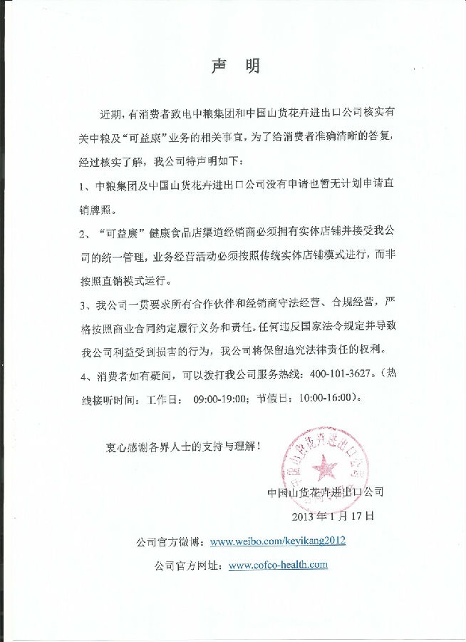 2013年1月17日,中糧集團(tuán)中國(guó)山貨花卉進(jìn)出口公司發(fā)布了關(guān)于“可益康”業(yè)務(wù)的重要聲明,文中表示中糧集團(tuán)及中國(guó)山貨花卉進(jìn)出口公司沒(méi)有申請(qǐng)也暫無(wú)計(jì)劃申請(qǐng)直銷(xiāo)牌照。