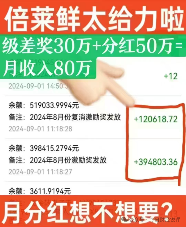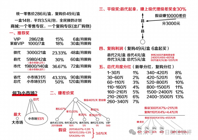 蓓萊鮮羊奶粉的代理制度設(shè)計(jì)之精巧,回報(bào)承諾之誘人,令人咋舌。只需購(gòu)買(mǎi)286元產(chǎn)品即可成為代理,通過(guò)發(fā)展團(tuán)隊(duì)最高可享50%銷售提成,還有級(jí)差獎(jiǎng)、平級(jí)獎(jiǎng)、復(fù)購(gòu)利潤(rùn)和百萬(wàn)級(jí)月分紅。