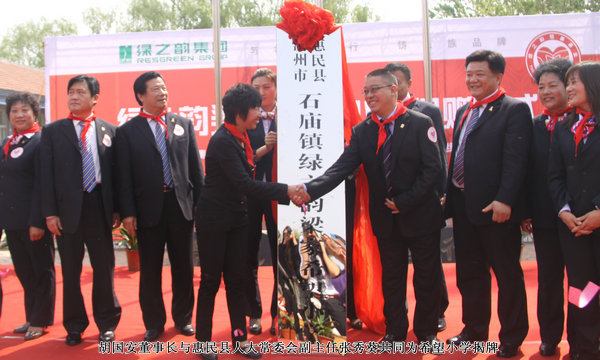 山東省青少年基金會副秘書長王太麗接受捐贈,并對綠之韻集團對社會的人文關懷表示肯定?;菝窨h人大常委會副主任張秀奎與綠之韻集團胡國安董事長共同為希望小學揭牌,并向胡國安董事長頒發(fā)了惠民縣榮譽市民證書。